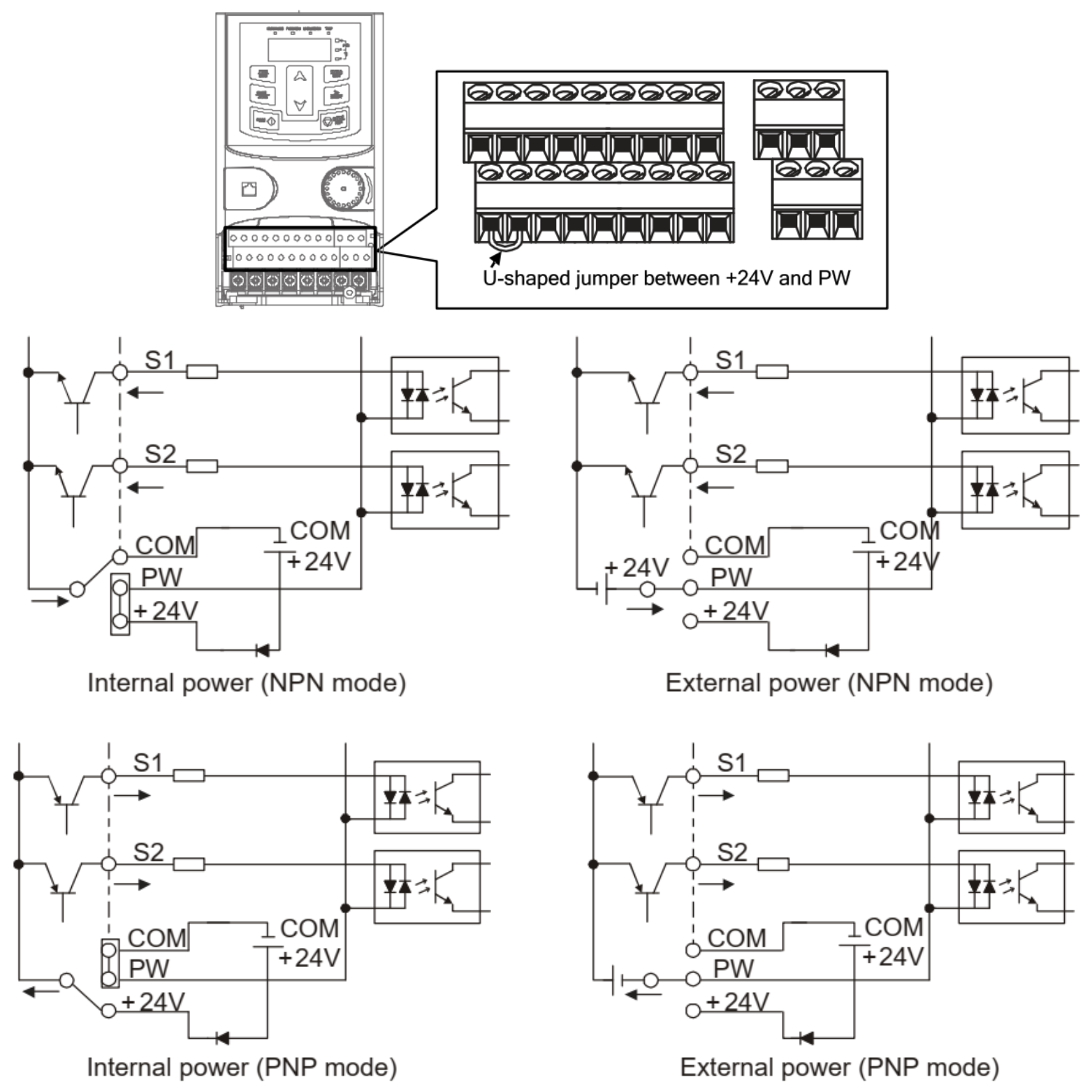 Điều chỉnh jump chữ U để chuyển đổi giữa kiểu đấu NPN S1-COM và PNP S1-24V