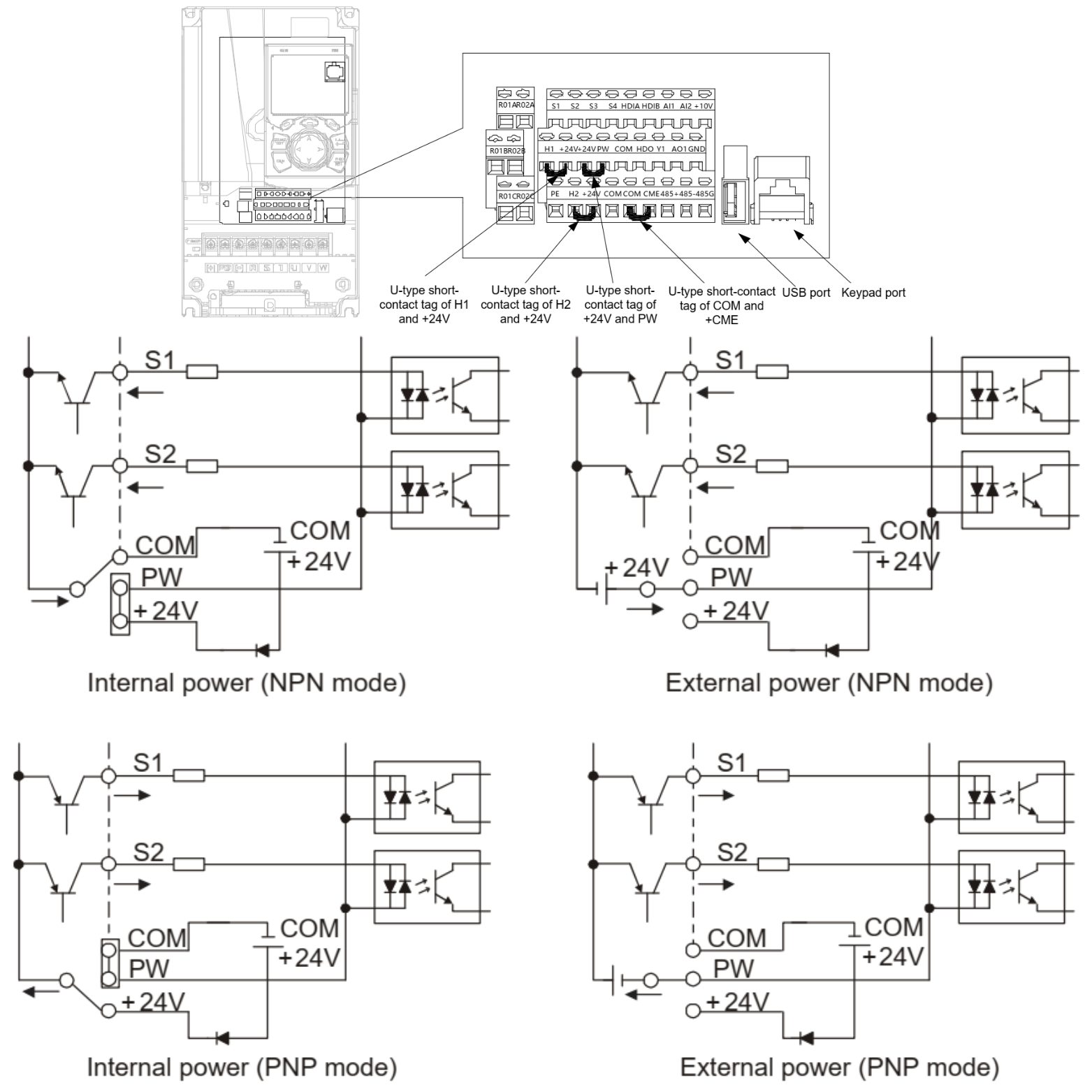 Điều chỉnh jump chữ U để chuyển đổi giữa kiểu đấu NPN S1-COM và PNP S1-24V
