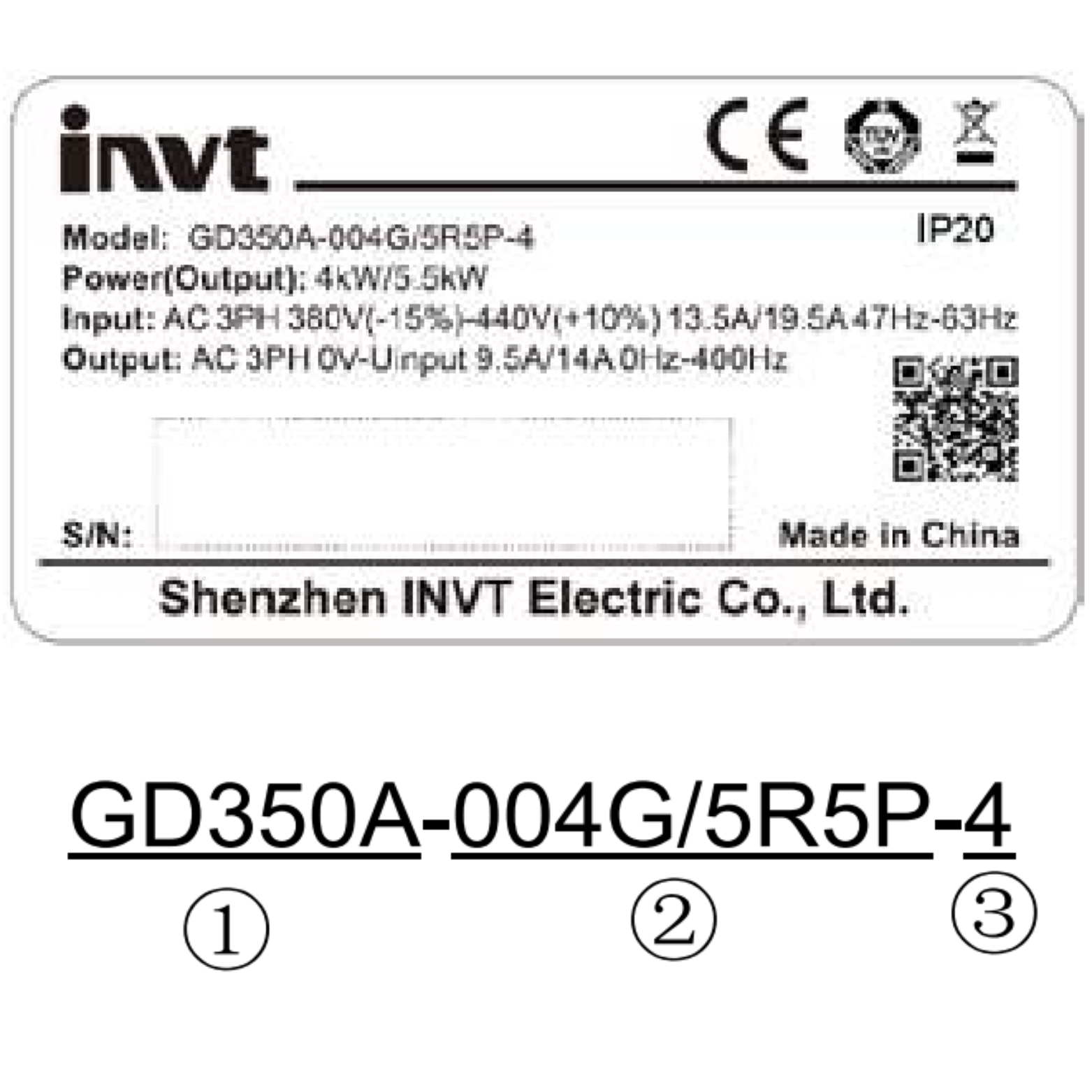 | ① | Dòng sản phẩm | GD350A: Dòng biến tần đa năng hiệu suất cao Goodrive350A |